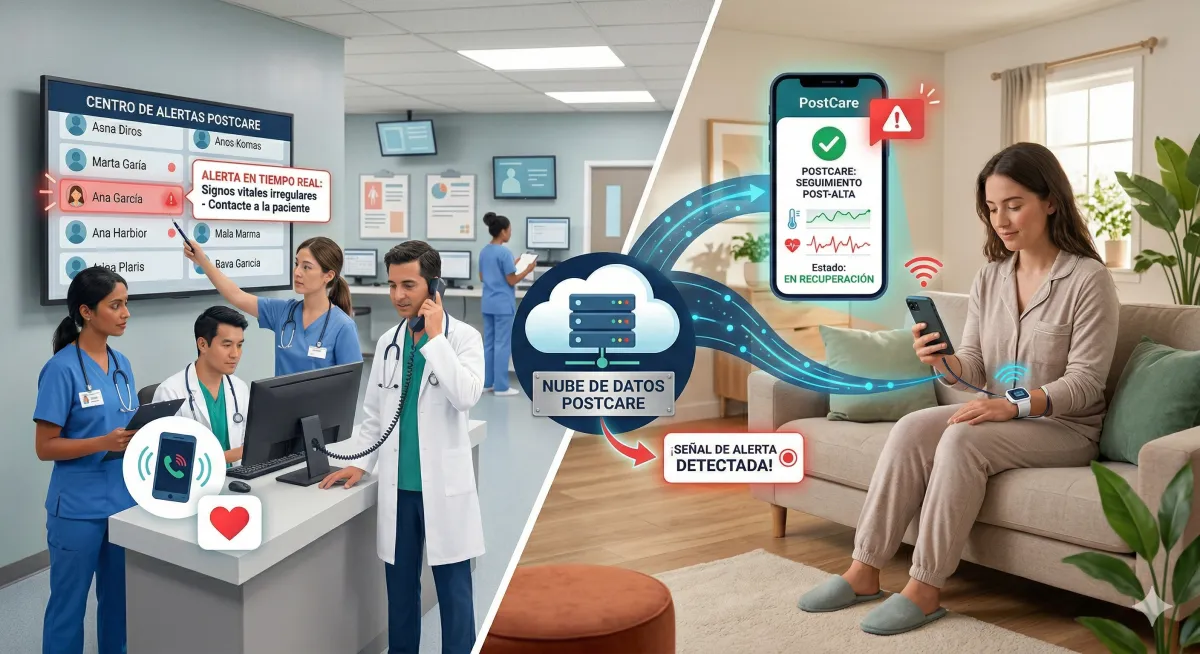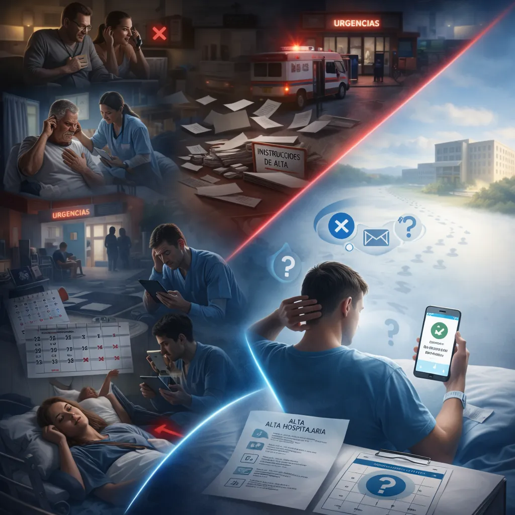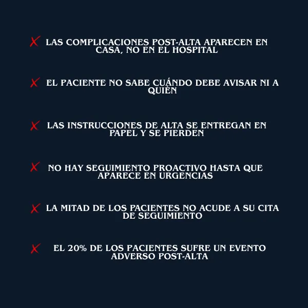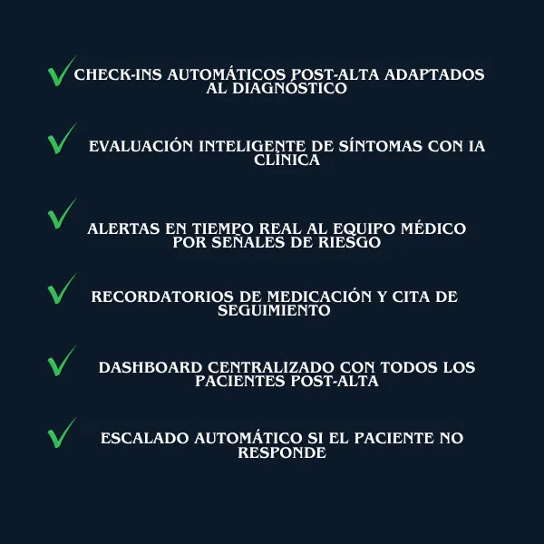 Check-ins adaptados: Día 1, 3, 7, 14 y 28 post-alta